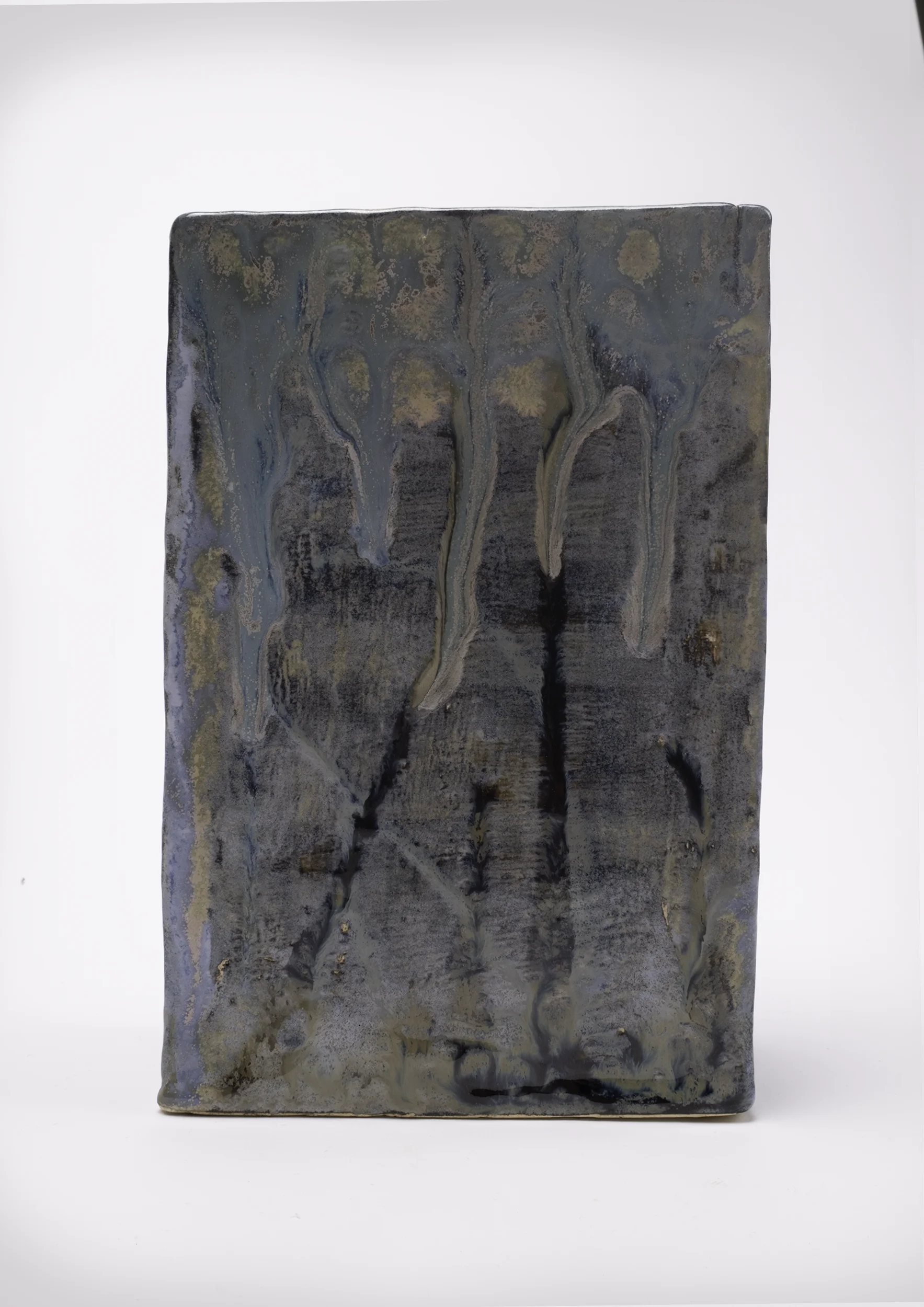 This geometric ceramic vase features a modern rectangular design with a distinctive surface texture. The glaze blends slate blue with natural earth tones, creating patterns that resemble weathered architectural surfaces. Dark bands near the base add visual interest and ground the overall design. Each side of the vase displays unique textures, making it both a functional vessel and an eye-catching decorative piece.