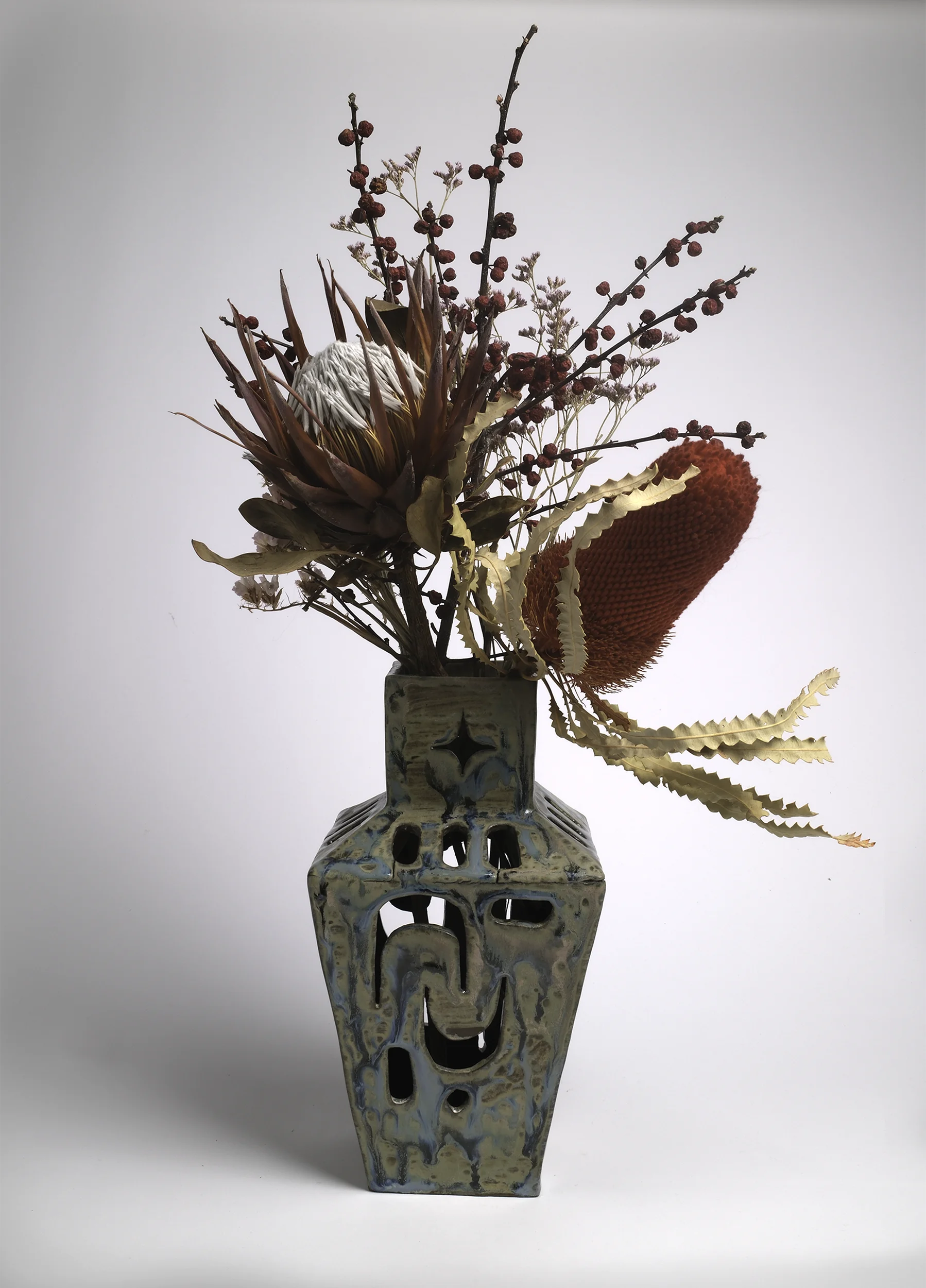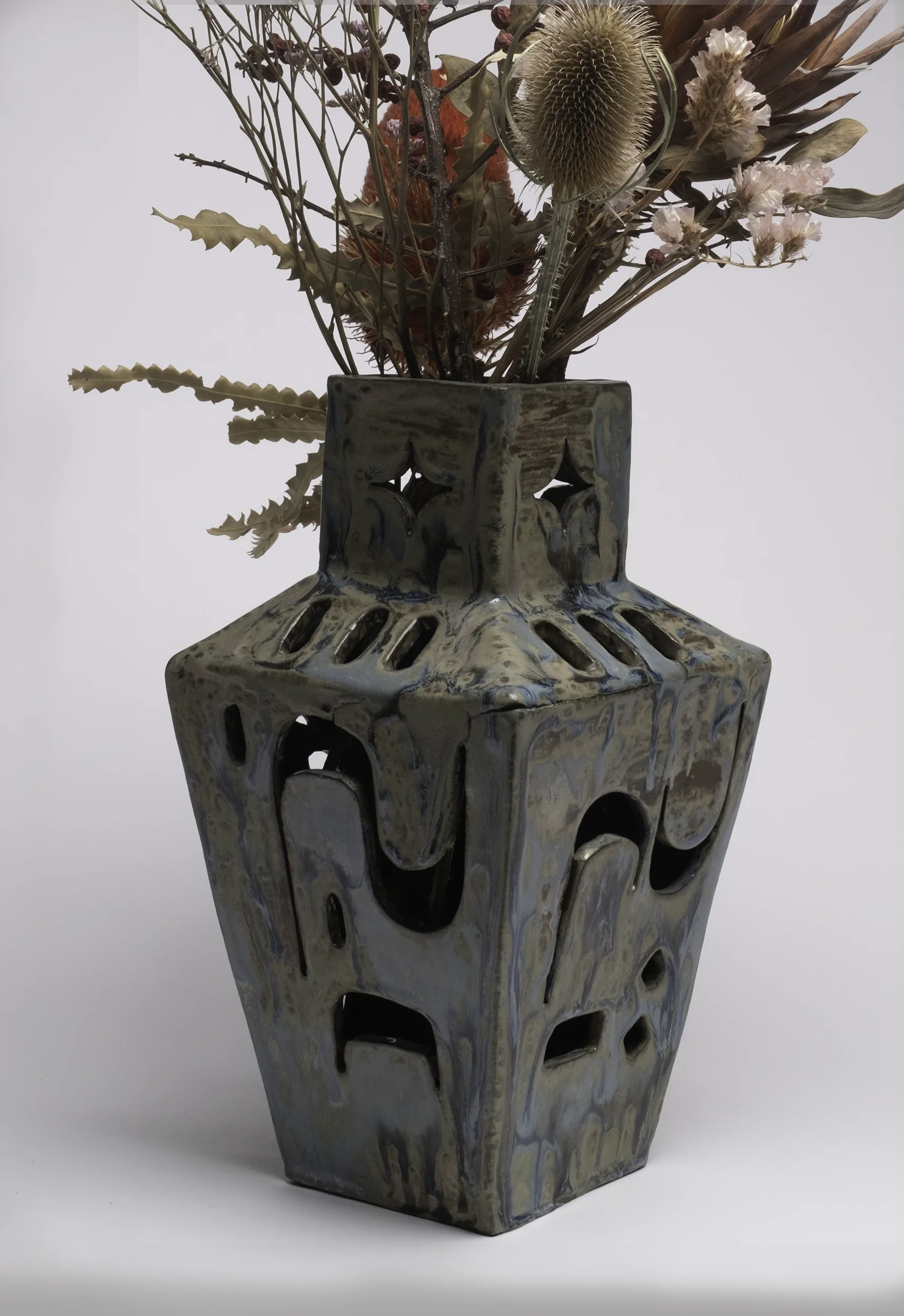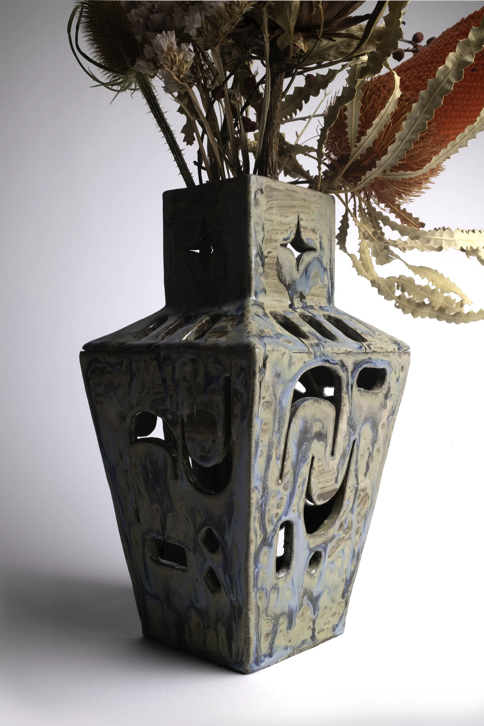 This vase combines the art of clay with abstract calligraphic symbols. The symbols, which resemble a language but carry no specific meaning, are carefully cut into the surface, creating an intricate, three-dimensional design. Their creation is a meditative process, focusing on the act of being present in the moment rather than the final outcome.