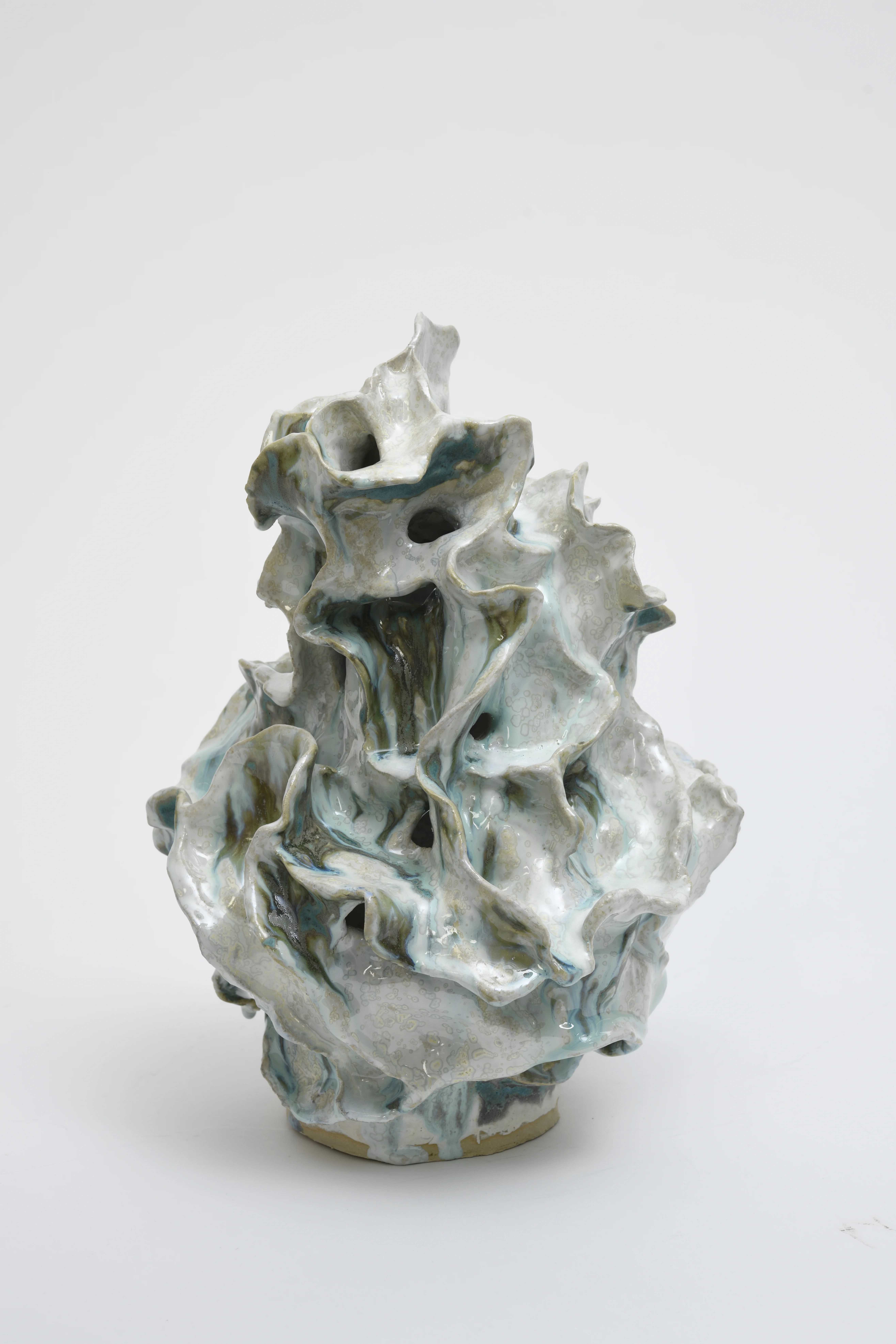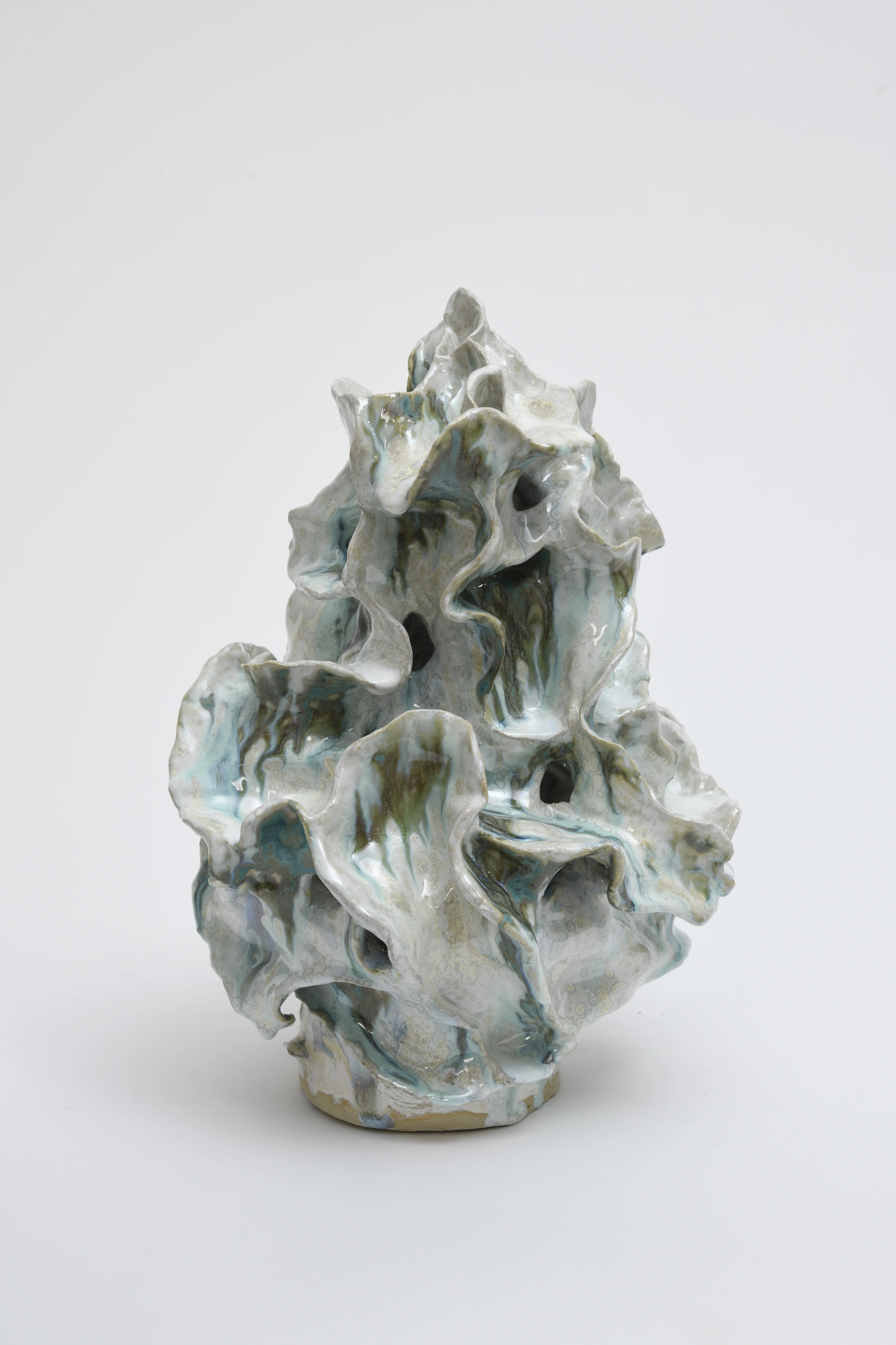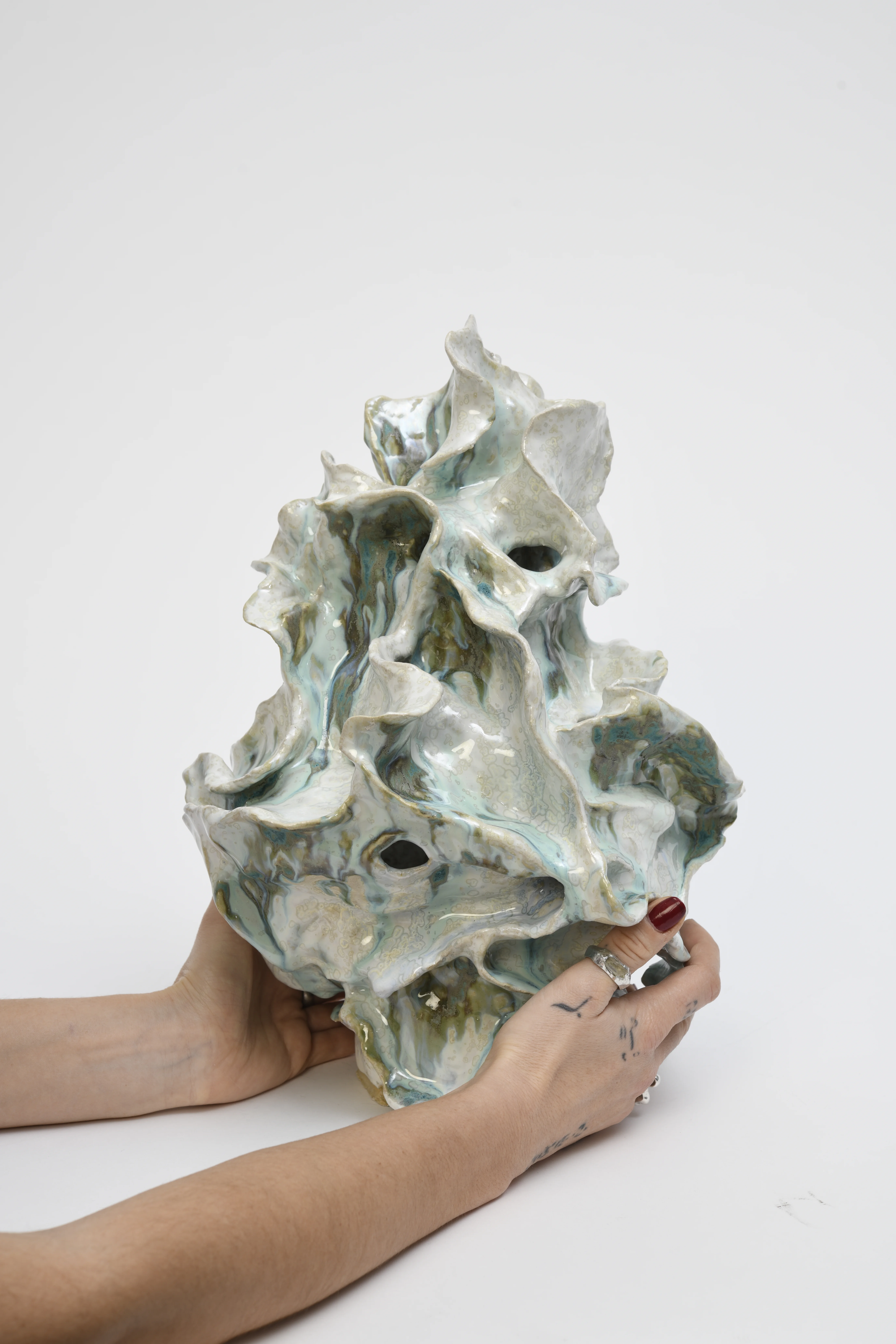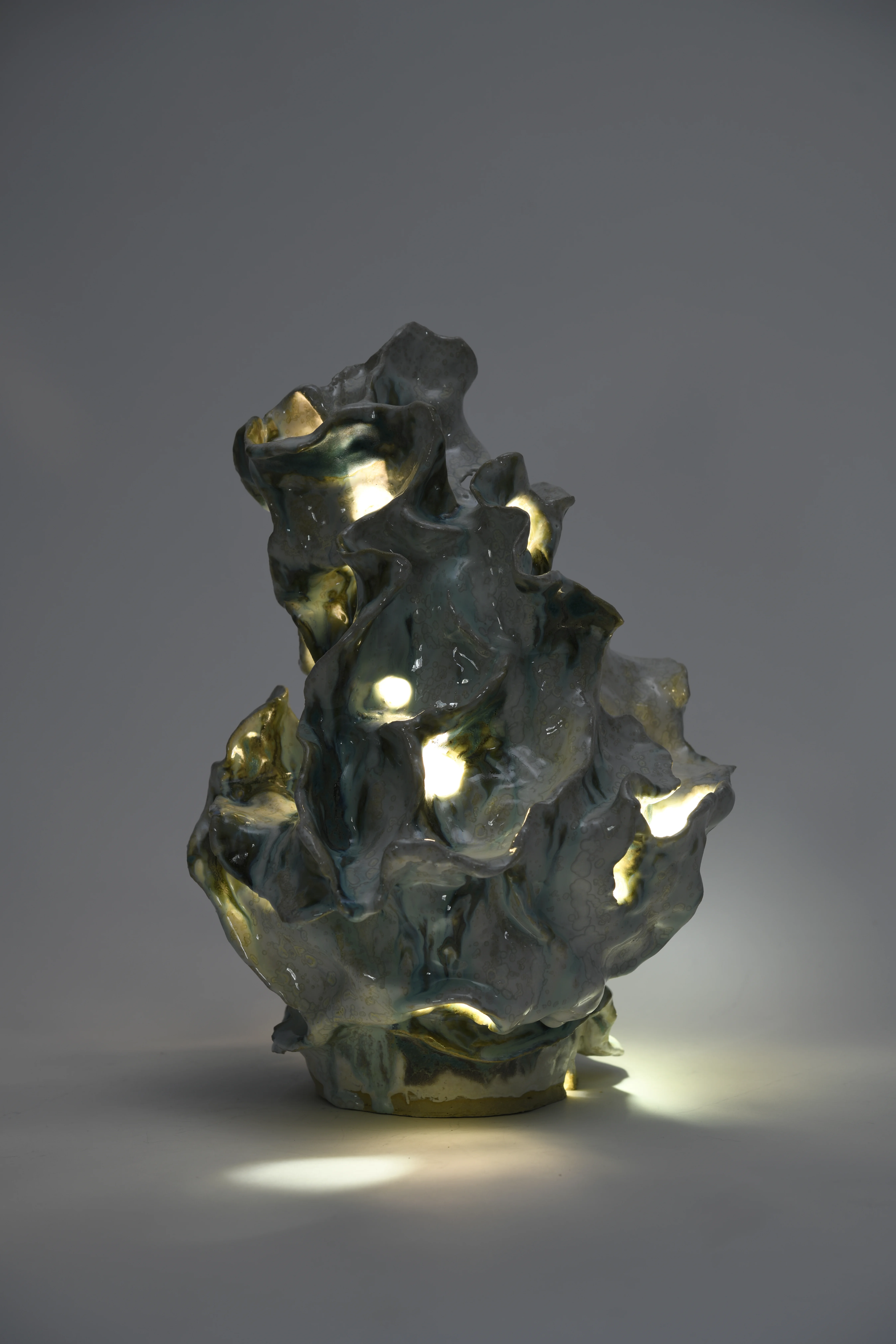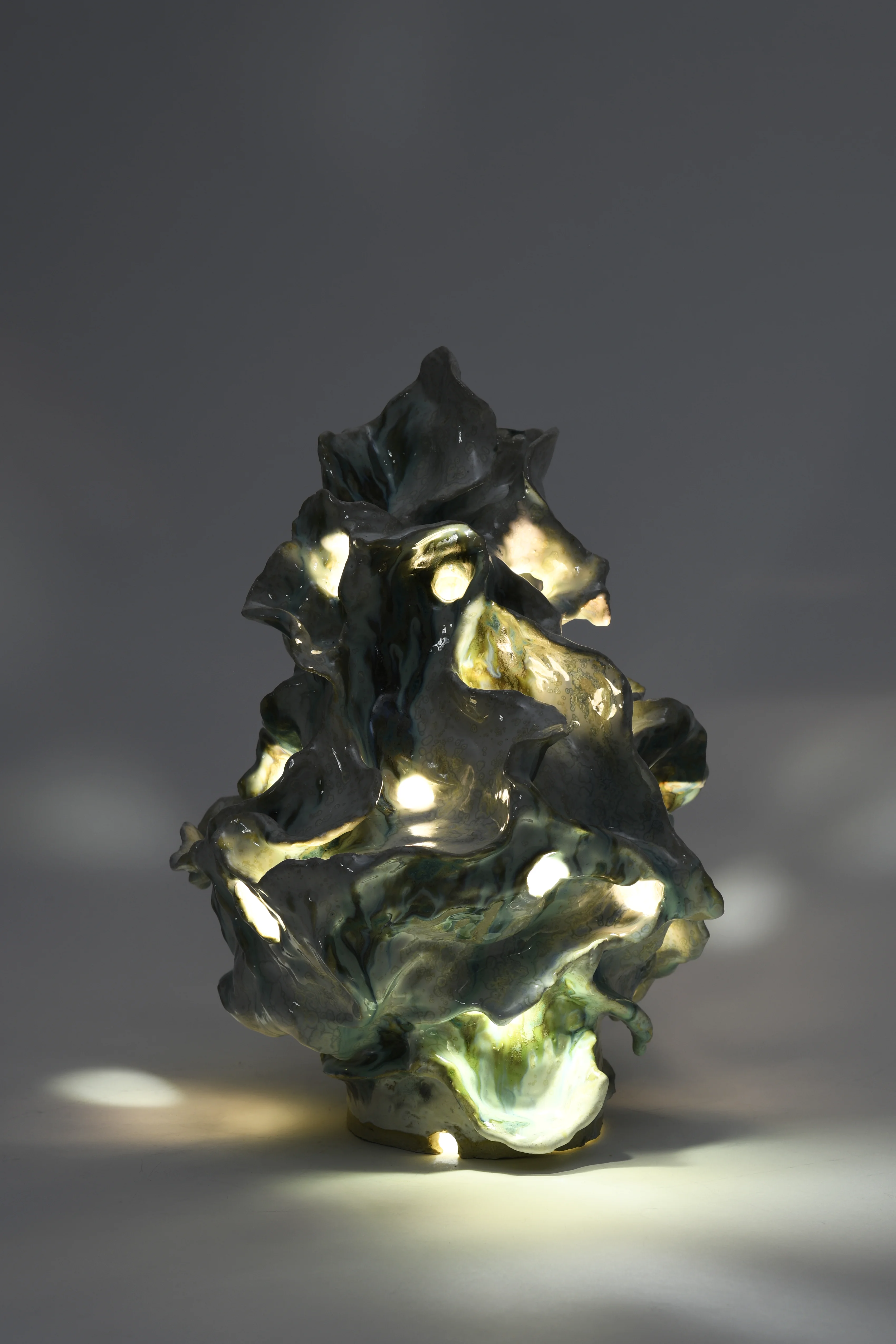 This piece began as a commission but grew into something that felt almost alive. The form opens slowly, like leaves stretching toward the sun or petals just before they bloom. A soft crystalline glaze settles into pale tones that blend with deep greens, giving it depth. There’s a light placed inside, so the sculpture has two different personalitys. During the day, you see the shape and surface; at night, it glows from within and new contours appear in the shadows it casts. It brings a gentle, atmospheric light to a room.